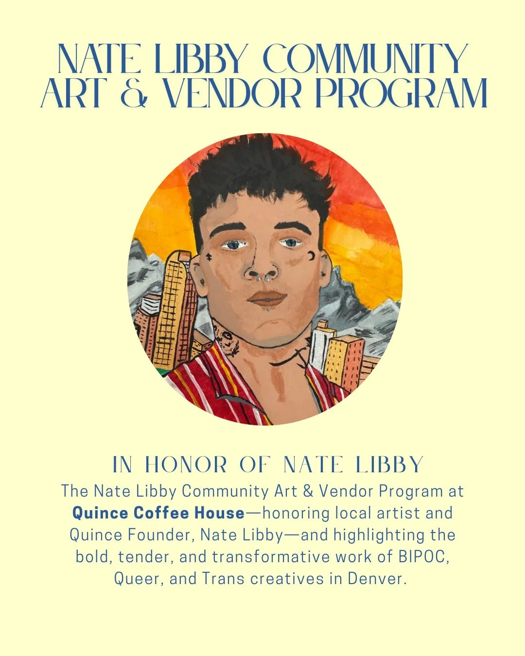 The Nate Libby Community Art & Vendor Program at Quince Coffee House is a celebration of local creativity, identity, and community. Named in honor of Nate Libby—a beloved local artist, nephew of one of our owners, and part of the original founders that opened Quince—this program uplifts the bold, the tender, and the transformative work of BIPOC and Queer artists in the Denver area while honoring Nate’s belief in the importance of accessible creative spaces. Places where artists and vendors can share their work, connect, and thrive in community.